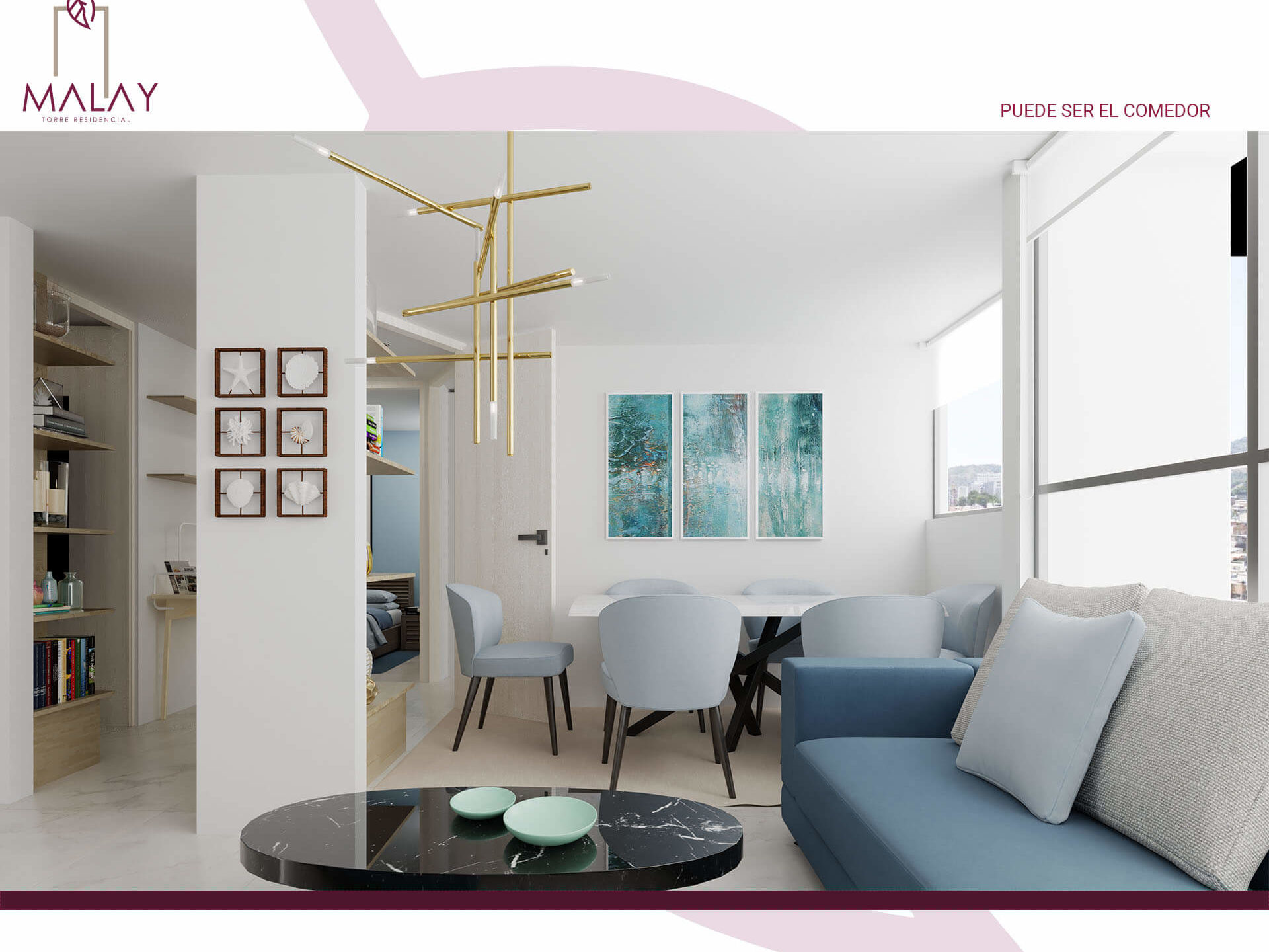 Malay se desarrolla en un edificio con dos interiores El primer interior consta de 15 pisos y tendrá dos ascensores; el segundo interior consta de 16 pisos y tendrá dos ascensores. Ambas torres tienen vistas hacia la ciudad o hacia las zonas sociales del proyecto.