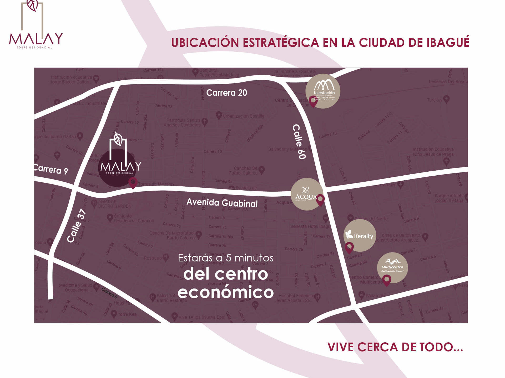 MALAY está localizado en la ciudad de Ibagué, departamento del Tolima, cerca a la zona comercial de la ciudad. El sector cuenta con centros comerciales, clínica y supermercados; MALAY esta sobre la Avenida Guabinal lo que ofrece conexión vehicular con cualquier punto de la ciudad y medio de transporte.